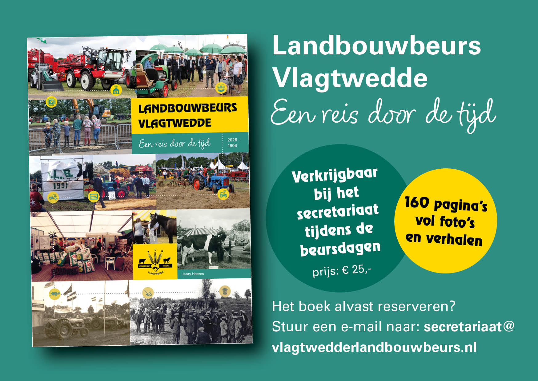 Het boek kost 25 euro en is verkrijgbaar bij het secretariaat tijdens de beursdagen. Alvast reserveren? Dat kan ook! Stuur een e-mail naar secretariaat@vlagtwedderlandbouwbeurs.nl